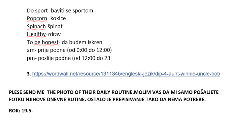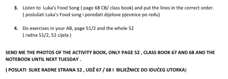 jučer smo u školi ponavljali voće i povrće, čitali Uncle Bob I Aunt Winnie, pregledavali zadaće. Idući tjedan će sva djeca koja još nisu čitala za ocjenu čitati , a ako vam djeca ne dolaze u školu , onda mi morate obavezno do 1.6. poslati snimke. Šaljem vam što smo pisali na ploči . Domaća zadaća je 54ta strana u rb, Zadaću više ne trebate slati nego će ju djeca pokazati u školi.